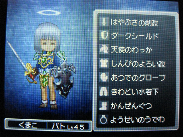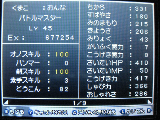DQ9ね。 という事で需要は無いだろうけど主人公の成長具合をば。 先に言っておきますけど、ネーミングセンスとかについて小一時間問い詰めるとか、そういうツッコミは要らないです。 もう今更、わかりきってる事ですし。 あと、服装センスについても不問にして下さい。 まもりのスパッツの方がまだ見栄えが良いと思うけど、でもこれが私のセンス。 コテコテの前衛アタッカータイプです。 その割にはパラディンの「はくあい」を全然とってませんが。 好きな前衛職は戦士>パラディン≧バトルマスター。 なんでバトルマスターにしたんだっけ・・・?折角盾スキル振ったんだから、だったかしら。 スキル構成は ゆうかん100 きあい100 とうこん82 おたから16 きょくげい16 まほう8 剣100 オノ100 盾100 素手3 素手3とかwww と思われるでしょう。私もそう思う。 石投げとかまじ要らなかった。どうせ素手とるなら100をおすすめします。 それなら相当使い勝手良さそうなんで。ばくれつけんとか。 「はくあい」があれば守備面で鉄壁になれますが、「ゆうかん」とったし後でいいや、と。 補助系2人の仲間(2人ともはくあい完備)と守備力が大差無い('A`) クマひろ(前衛系逆毛)に「はくあい」と「ゆうかん」つけたら守備力が500超えたわけで。 パラディンほんとパネェっす。 代わりに「とうこん」を上げたので攻撃力は断トツ。 次の予定は「はくあい」だな・・・守備力+100・HP+80は大きすぎる。 フォースとかは他の仲間にとらせたし、秘伝書持たせたからいいや。 まだまだ楽しめそうで困る。本編終わってからも配信クエとかあるしねー 他の人に比べると牛歩すぎるのが私。 というわけでこの辺でヾ(・ω・)ノ" PR
