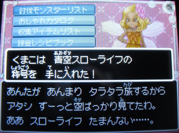 × [PR]上記の広告は3ヶ月以上新規記事投稿のないブログに表示されています。新しい記事を書く事で広告が消えます。 どーも、隈宏です。お久しぶりの更新で。 ところで今日はまだ27日なんですが。密林さんこれ発売日明日じゃね? まぁ、でもこれで勝つる。 では以下近況などなど。 ・・・しかし完全に風邪ひいた。久しぶり。 やっぱり健康は大事。 ■RO 気付いたらチケットの30日過ぎてまして。 DQ9ばかりでした。というか、帰宅→DS起動→朝 みたいなタイムリープ現象が起こるんですが。 歳なんですかねー 今も変わらずのあのドット絵的な感じは良かったんですけども、世界が色々と変わってて。 DQとか終わってないしな、とイマイチ触れずに終わってしまった、という。 ■ドラゴンクエストⅨ 寝落ち容疑者回避! ということで、いわゆる「本編」クリアです。 先週の日曜くらいに。 前回、主人公のスキル・ステとかを書いたんですけども。 なんか気がついたら、ラストダンジョン突入時に「はくあい」「さとり」が100になってた。 なにを言っているのかry 賢者に転職する為の条件は「トロルキングをメラでトドメ×5回」。 本編中でトロルキングが出てくるのってラスダンなんですよね。 宝の地図で普通に闊歩してたからそっちでやってきた、と。 で、その地図、すれ違い通信で運良く入手してたはぐれメタルonlyフロアのある地図だった、と。 嫌いなスライムはスライムマデュラです。 まだこの地図に潜り始めの頃は、何度も全滅させられそうになった。 はぐメタのお供で出てくると鬱陶しさが段違いだった。そう思っていた時期が私にもありました。 あと、アイアンブルドーもなかなか鬱陶しい。マデュラほどではなかったけど。 はぐメタフロアで、お供にこの2種が出てくるとハラワタが煮えくり返った程です。 肝心のラスダンとかラスボスとかの事全然書いてないな・・・ 上述の宝の地図程度のモンスターランクが気にならない、そんな実力のある冒険者にはどうという事のない難易度です。 個人的にはラスボスよりマデュラが4匹くらいで徒党組んでくる方がイラッとすると思う。 (そんな敵構成は無いと思うけど。) その辺のバランスがどうなんだ、と首を傾げる所だと思う。 まぁでもこのDQ、実に良い出来だと思う。すれ違い通信とかは実に面白いシステム。 地方市民には諸刃の剣。 本編は終わってもまだまだやる事一杯で困る。 WiFiの配信クエストもあるしね。 とりあえず箱舟の免許もらいました。もっと実用的なモノをくだs というわけで今回はこれにてヾ(・ω・)ノ" PR