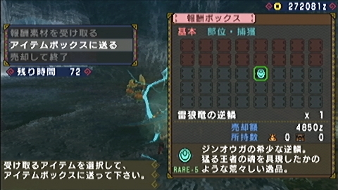でおなじみの隈宏です。 行こうぜ、とは言えない環境でござる・・・ というのも未だにハンターランク上げてません。 村クエ消化してました。★4のね。 で、「ラングロトラの上部が中々破壊出来ないな('A`)」 とか言いながら時間かけて何度も狩ってみたり。 時間かければ太刀でも部位破壊できますね。 とりあえず同じ獲物でも数回狩るというスタンスだから進まない事山の如し。 そんな中、村★4緊急クエに先日行ってまいりました。 そこで初めて気がついた・・・ 村クエ★2「ざわめく森」で乱入してくるヤツはまともな報酬くれないという事に。 甲殻と帯電毛くらいしかくれないんです。★2の時は。 尻尾切断しても、剥ぎ取れるのは帯電毛だか甲殻だったと思う。 後は超電雷光虫が採れるくらい。 その3種類だけ数が多いのが私のアイテムボックス。 「ざわめく森」だけで称号「最強」を手に入れた私に隙は無かった。 そんな中、上の画像ですよ。 初の★4「月下雷鳴」でこんなモンが貰えるとは嬉しいじゃないの。 このクエをクリアするとスタッフロールなんですな。 今はライキリとジンオウヘルム作って温質上げたりしてた所です。 あと、オトモ装備が恰好良いです。アイルーがああいう装備すると可愛い。 ぼちぼち他の大型モンスターとも戦わないとなぁ・・・ というわけで近況でした。 もう3月とか本当に鬱ですヾ(・ω・)ノ" |
